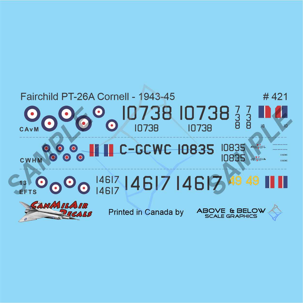 Markings for three complete sets: No.13 EFTS (1944), as well as the examples on display at the Canadian Air and Space Museum, and Canadian Warplane Heritage Museum.